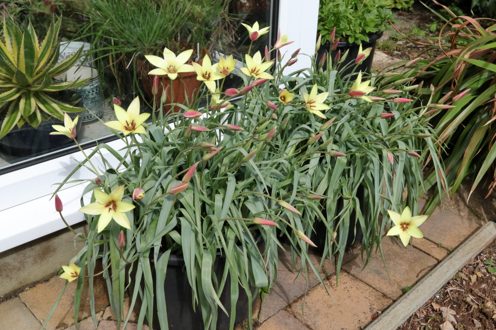 Tulips. I put off buying tulips until they were going cheap in December, then split 100 Tulipa clusiana ‘Cynthia’ between two 20L pots, intending to put them in the two holes in the front garden that were occupied by Alstroemeria last summer. In they went, then straight back out again because they are nowhere near tall enough. They were almost invisible. So now they’re just pot fulls out the front.