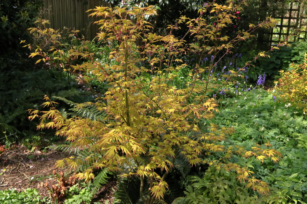 Acer ‘Orange Dream’ has leafed out a lot since last week; it’s looking lovely but I’m wondering whether I should have pruned off some of the lower branches to get more growth from the upright stems. I want it to form a canopy over the shady area, not fill the middle of it. It can’t be done now until late summer, or the plant is liable to bleed heavily. I might have to do a bit earlier, if it is interfering with other plants.