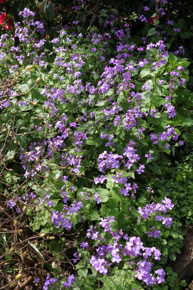 Lunaria ‘Corfu Blue’ has kept itself going by self seeding for several years now, unlike the standard honesty which I haven’t even managed to keep going from collected seed. It’s a bit of a thug, with big coarse leaves that can smother less robust plants if not kept in check. Worth it though.