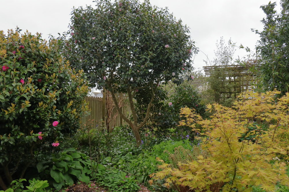 Camellias are conveniently malleable plants, which is an advantage in a small garden as it means they can be restricted in size by pruning, as well as being shaped to suit various purposes. C. ‘Charles Colbert’ is part of the boundary of my shady area and since I want to grow things under it, I have cleared its lower branches to make it more tree like, and I thin its canopy to let a little more light through. It’s still a bit crowded in the right hand third. There’s a Eucryphia to the right of it that needed more space too.