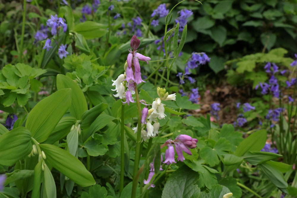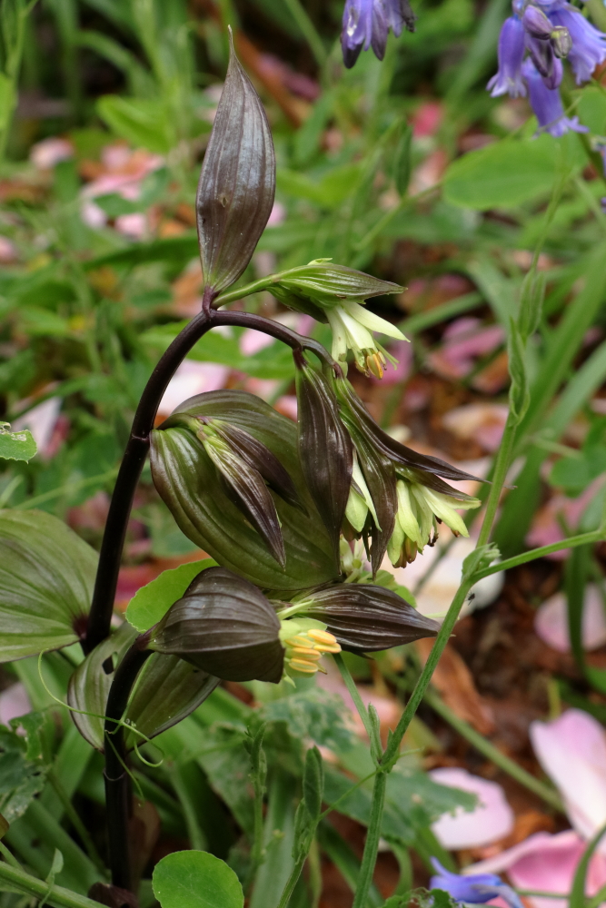 Jostling for space amongst bluebells, Solomon’s seal and perennial sweet pea is Disporum bodinieri, which all too often is a prime target for slugs which eat through the stems at the base. OK, it’s interesting rather than showy, but a lot of woodland plants are like that.