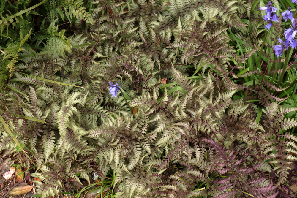 I have ferns putting up new fronds all over the garden, mostly in the shady bits. I’ve taken the old fronds out on most of them, too late with some, making it difficult to do without damaging the new fronds. The alternative is to do it before the new leaves unfurl and endure seeing the emerging leaves being battered by rough weather, as well as leaving an empty space. Neither option is entirely satisfactory. I’ve gone for Athyrium nipponicum ‘Burgundy Lace’, with bluebell.