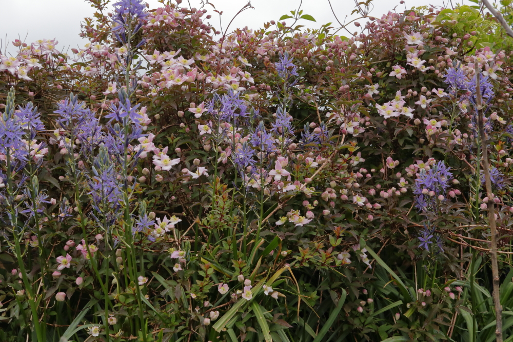 Context is everything. On its own in the garden, the rhododendron above looks quite blue. Set against the pink of Clematis montana ‘Elizabeth’, these Camassias appear a much clearer blue than they really are. The clematis is on a fence between us and a neighbour and the side facing us is the south side. It’s working well for us; we never see those neighbours so I don’t know how it is for them.