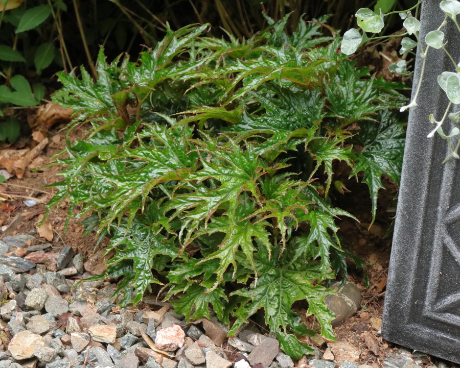 The foliage of my plant of this is similar to the aforementioned B. pedatifida ‘Appalala’ but more deeply lobed and somehow sharper in outline. Red spotted petioles, though largely hidden below the leaves, make looking more closely worth the effort. It produces bulbils at the point where the leaf blade meets the petiole and they quickly grow into plantlets during the growing season. If they form very late they stay as bulbils, fall to the ground with the collapse of the leaves and start into growth in the following May. The plant itself, for all its similarities in appearance with B. pedatifida, doesn’t start into growth until May and progresses very slowly for some weeks. I have my plant growing under a large bamboo where it can get very dry and it still needs less supplementary watering than B. pedatifida. It was protected with a covering of leaves in the same way as B. pedatifida ‘Apalala’ and B. emeiensis but unlike them was not tempted into growth in the middle of winter, making it rather easier to manage.