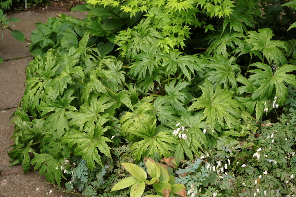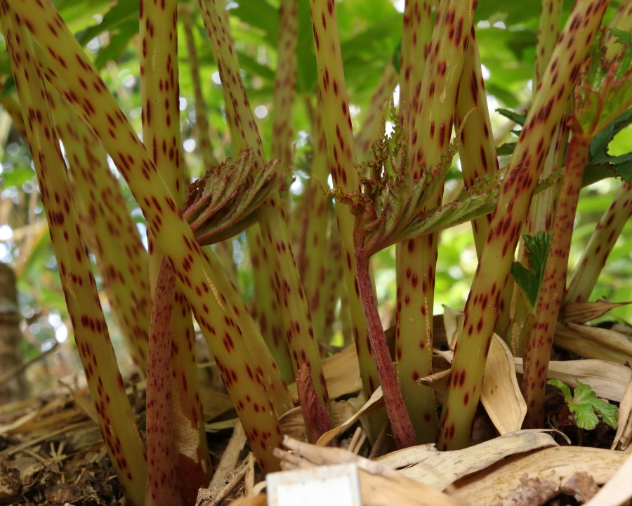 The foliage of my plant of this is similar to the aforementioned B. pedatifida ‘Appalala’ but more deeply lobed and somehow sharper in outline. Red spotted petioles, though largely hidden below the leaves, make looking more closely worth the effort. It produces bulbils at the point where the leaf blade meets the petiole and they quickly grow into plantlets during the growing season. If they form very late they stay as bulbils, fall to the ground with the collapse of the leaves and start into growth in the following May. The plant itself, for all its similarities in appearance with B. pedatifida, doesn’t start into growth until May and progresses very slowly for some weeks. I have my plant growing under a large bamboo where it can get very dry and it still needs less supplementary watering than B. pedatifida. It was protected with a covering of leaves in the same way as B. pedatifida ‘Apalala’ and B. emeiensis but unlike them was not tempted into growth in the middle of winter, making it rather easier to manage.