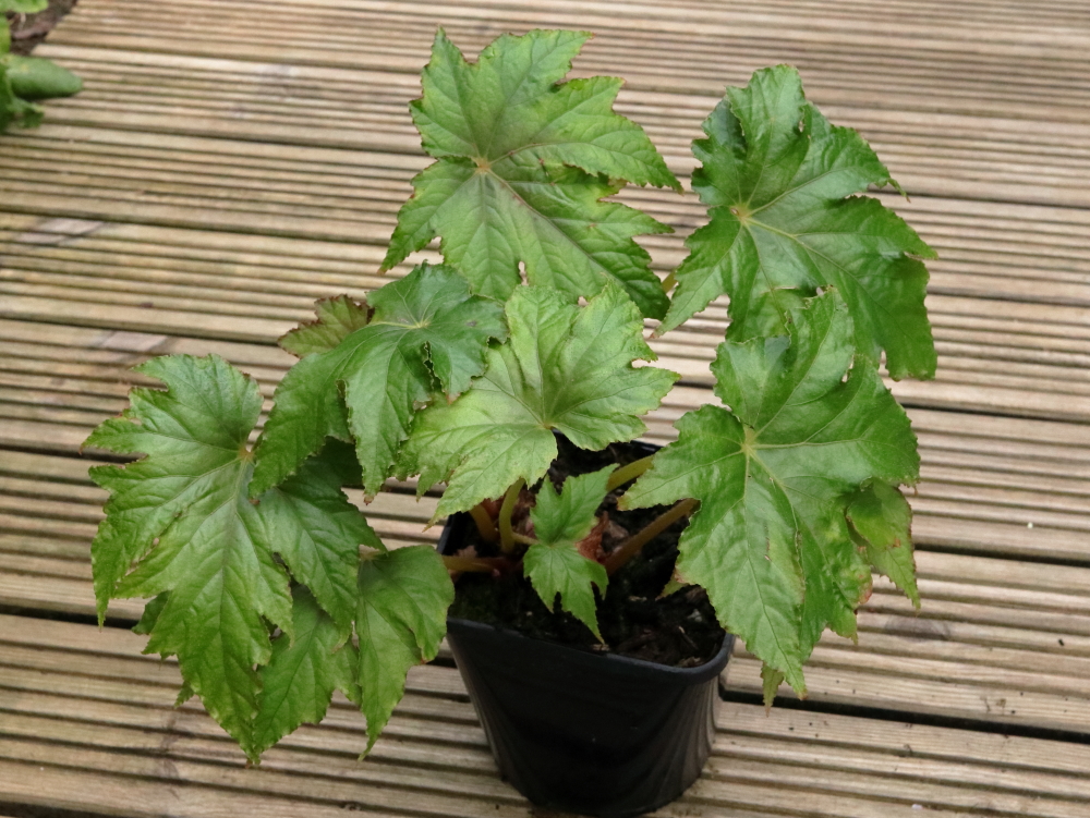 I purchased a plant from a stand at the Royal Cornwall Show which was simply labelled Begonia palmata. I have had B. Palmata ‘Tie Dye’ for some years and this barely looked like it could be the same species, having green leaves arising directly from a stout soil hugging rhizome, rather than the upright clump of stems of ‘Tie Dye’. There is a slight red flush at the centre of some of its leaves, it is otherwise all green. It is now flowering, on a stem directly from the rhizome and not rising above the leaf canopy, pale pink in colour. Again this is very different from ‘Tie Dye’, which produces its flowers from leaf axils towards the top of its stems.