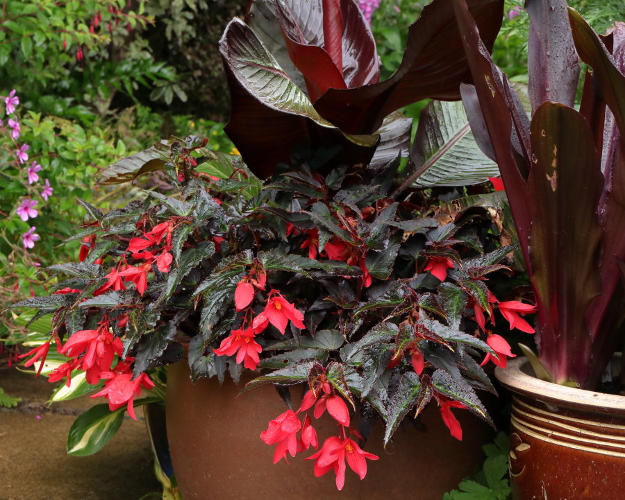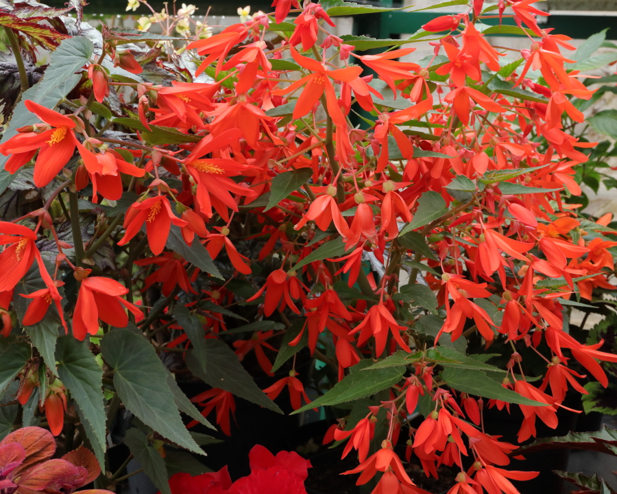 The plant in the middle has a label saying ‘Minstrel Orange’ and I think it was just a bedding plant purchase where we bought half a dozen and they were all slightly different, so presumably seed raised. The plant on the left has slightly bigger flowers of a slightly stronger colour and was bought as Begonia boliviensis ‘Santa Cruz’.
