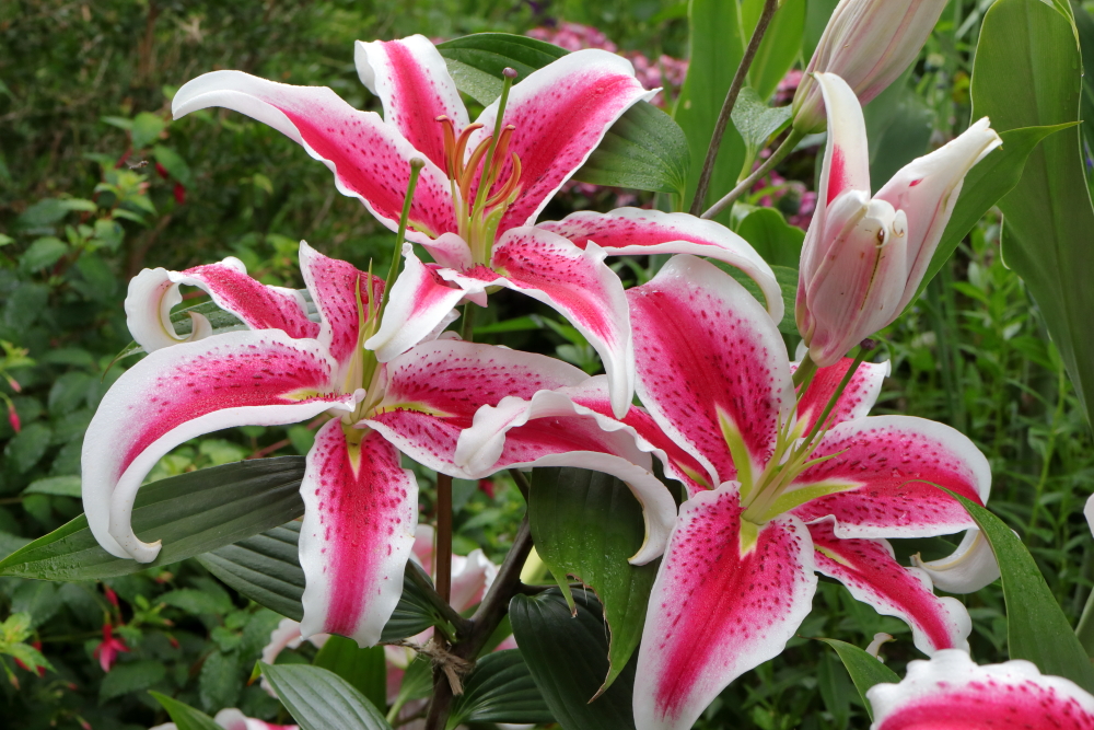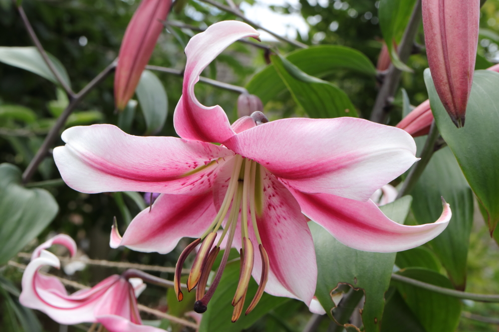 Lilium ‘Anastasia’ was the only variety that wasn’t inclined to grow upright even at the beginning of the season. I ended up putting canes in to support several of the stems as it produces quite a lot of enormous (19cm) flowers on each stem and the weight drags them down still further. Most of the flowers face down. Height 1.6m.