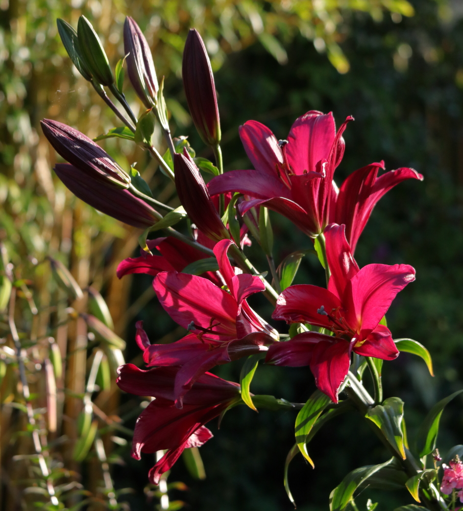 Lilium ‘Purple Prince’ has been very variable in the height produced, with the tallest at 1.6m but others less than 1m. 16cm flowers in early to mid July.