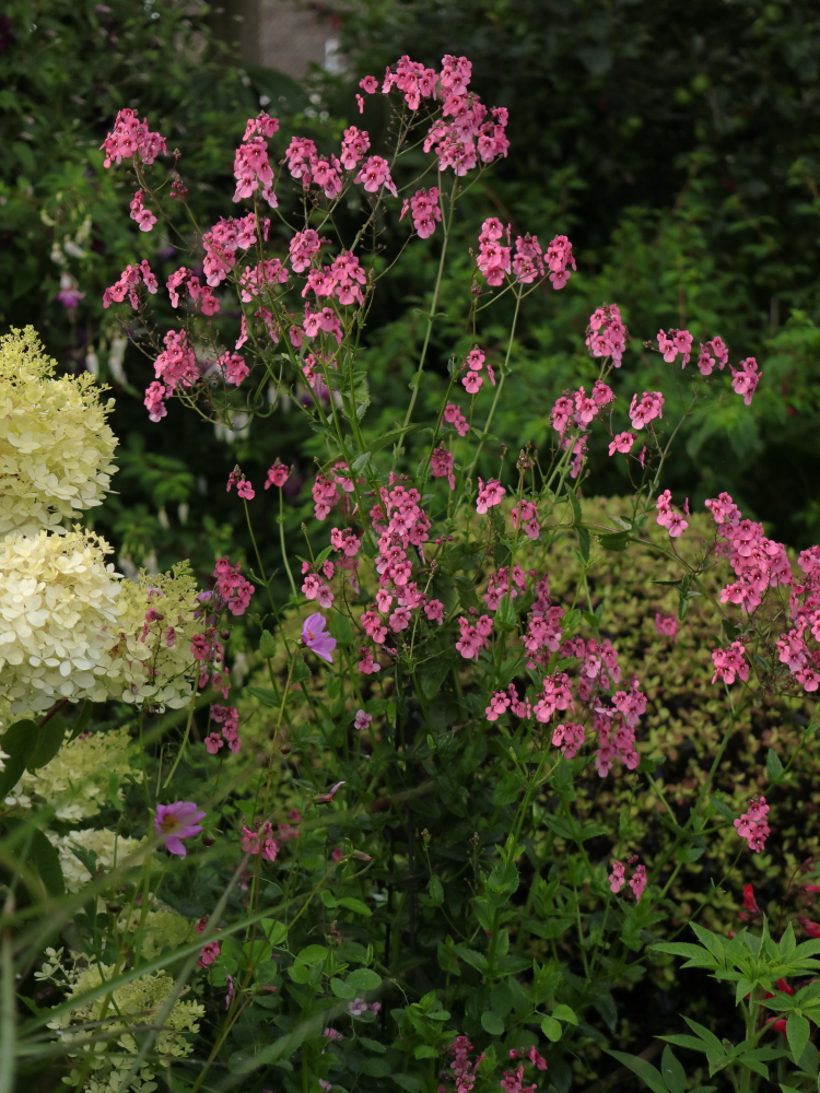 Diascia personata is another plant that gives great value for money. It’s easy from cuttings so we keep it going from year to year with cuttings struck in late summer and overwintered in the greenhouse. It’s a sprawler, so we have finally found the perfect plant for a couple of wire frames around three feet tall, for which everything to date has turned out to be too tall.