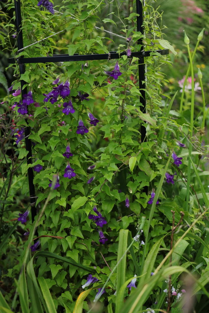 I’ve grown a lot of plants for the first time this year and there’s no doubt that the lilies have been the most eye catching. Maurandya barclayana has the feel of a plant that I will still be growing in ten years time though. I didn’t know it when I added it to a small seed order last year, mostly to make up the numbers and justify the cost of postage. These were sown mid May last year, overwintered tied to 18 inch canes in 9cm pots, planted out this spring, some of them in a hanging basket, some in the ground. It seems happy to climb a support or over another plant with minimal tying in, it’s 5 feet or more tall and showing no sign of stopping, the slugs don’t seem interested in it and I love the colour of its flowers. How hardy it is remains to be seen, I may bring in the hanging basket and I hope to be able to collect seed.