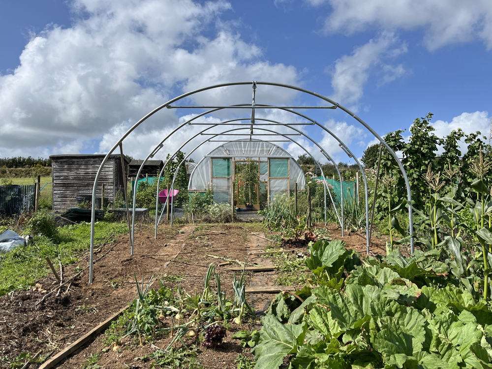The tunnel. By Tuesday of this week it looked like this with the metalwork pretty much complete. The action then moved back here because I needed a flat surface to build the doors and door frames. Now I have to get them back up to the allotment in a very modest sized car, along with the rest of the timber. The tunnel behind mine is on my neighbour’s plot and mine is much the same model, but 15 feet long rather than their 25 foot.