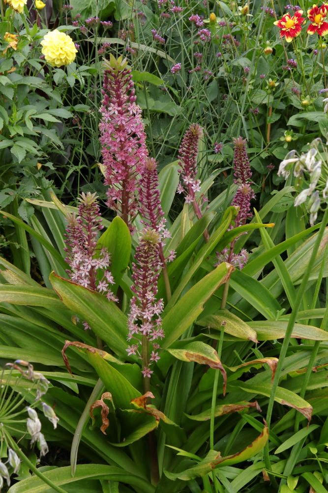 Eucomis ‘Pink Gin’ came out on top in a Wisley trial some years back and I’ve not come up with any reason to dispute that decision. I have it in the ground, it comes back each year bigger and better and like all the Eucomis has a long flowering season and interesting foliage, making it excellent value for money and the space it occupies.