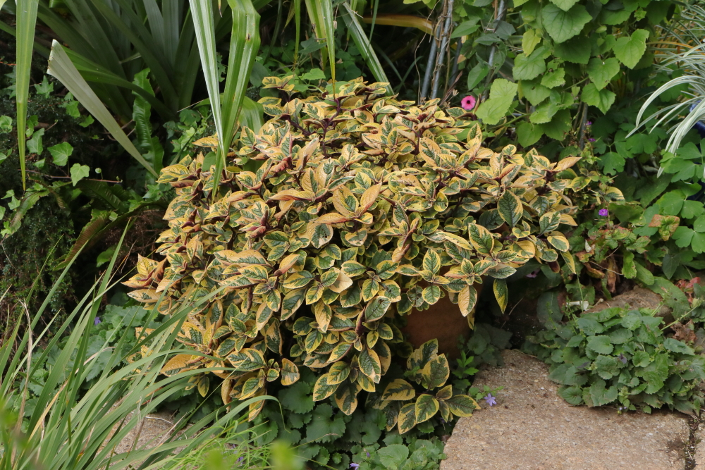 Plectranthus ‘Santana’ is another tender perennial that we picked up somewhere and wouldn’t want to be without. Dead easy from cuttings and fast growing, so like the Impatiens earlier, one for carrying over from one year to the next as small rooted cuttings taken late summer. I suppose it will flower; if it’s done so in previous years it passed me by. It was a bit straggly when it was planted out but has filled out beautifully. Gets Brownie points for not appealing to slugs too.