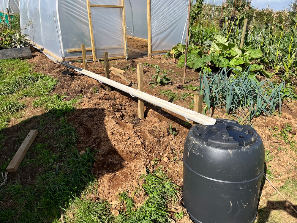 The ground being on a slope, there was a fall of 67cm from the bottom of the tunnel to the edge of the plot so I have sunk a water butt at the edge of the plot so that its top is just below the base of the tunnel and run a length of gutter (scrounged from next door, who just had theirs replaced) to the water butt. The tunnel roof should give me a 210L tank-full for every inch of rain and we get 49-59 inches a year.