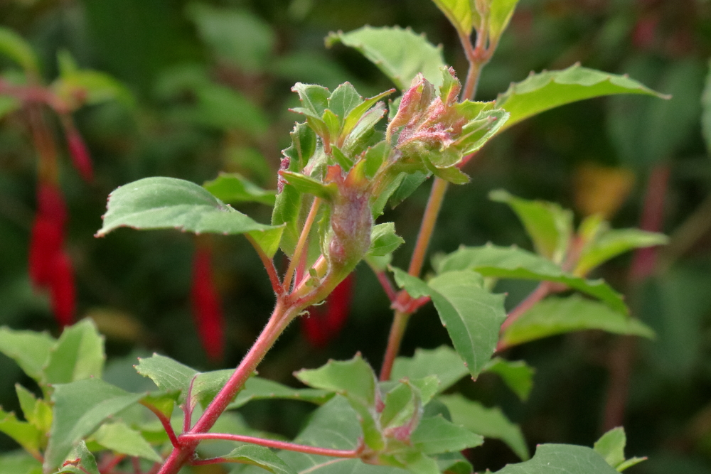 Fuchsia gall mite has started to appear on some of the Fuchsias we grow. Unfortunately there are several big bushes on the bank at the back of the garden, more or less on the boundary line but mainly on the other side of the fence from us, and they had quite a lot in them until I went snipping yesterday. My strategy, that has worked reasonably well for several years, is to maintain a high level of vigilance and remove to the dustbin every sign of it that I see. My hope is that by removing it very early that it won’t have had much chance to spread further. Unfortunately it mainly appears at the tips of the shoots where the flowers are but I’d rather sacrifice a few flowers than have the pest stop them a week or two later having spread much further. Here, so you know what it looks like, are some pictures of it. I take it off several inches below the infection.