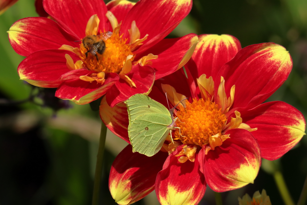 I went to take pictures of Dahlia ‘Danum Torch’ and while I was looking through the viewfinder a yellow butterfly appeared seemingly from thin air. Looking now at the first pho I took, it is in flight at the top of the picture. Ten seconds later it has settled, folded its wings and is hard to spot. It almost never opened its wings and only for a split second when it did. It’s a Brimstone.