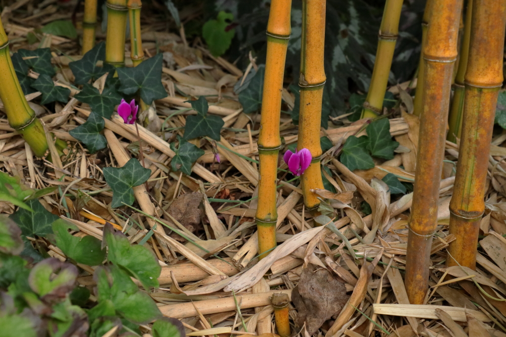 I had enough seedlings of Cyclamen hederifolium last year to think it worth trying them amongst the stems of our big bamboo. They do very well right under our massive fastigiate yew so I figured they’d have a fair chance of growing OK. Seems I was right, so far at least. Good colour form too. They’d have been corms about 2cm across, two or three years old.