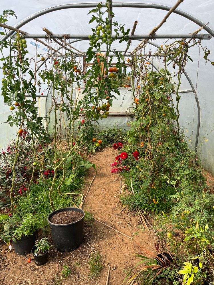 The tunnel that I’m leaving behind on the other plot looks like this. Tomatoes nearly done, a Dahlia to be dug up, various pots still to be moved. Outside there are four or five Camellias to lift and move. They are getting just the sort of watering from the deluge outside right now that they need to be movable.