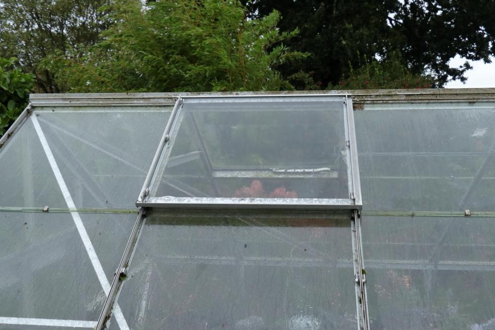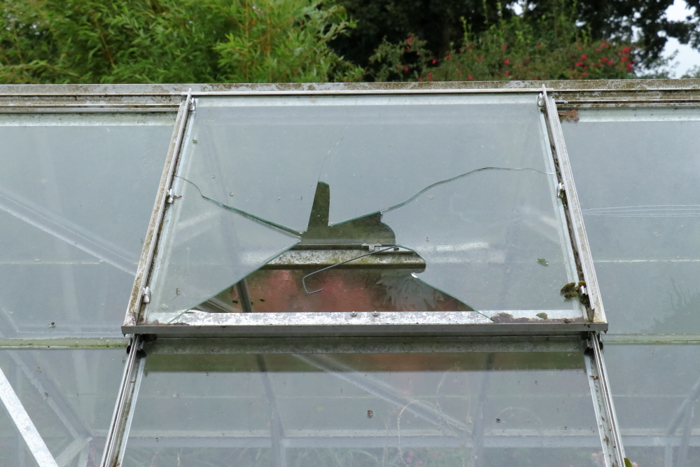 We had a very wet and windy day yesterday so I figured the algae that was starting to reappear on the roof of Sue’s glasshouse would be easily brushed off. When I got there with brush and hose it was to find broken glass on the floor and a hole in the roof. My first thought was that a branch had been blown through the air and hit the glass end on but there was no sign of a branch or any other projectile.