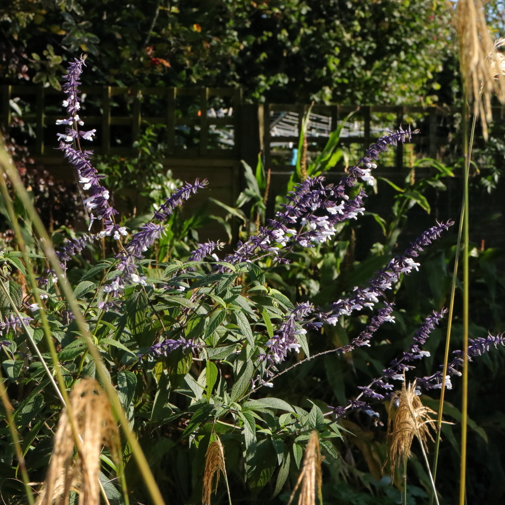 Salvia ‘Phyllis’ Fancy’. I had Salvia leucantha, which I’m pretty sure is one parent of this one, but it started flowering so late in the year it was pretty useless. In this, its first year, ‘Phyllis’ Fancy’ has done rather better but still didn’t get going until September. It’s very tall too, so not for the front of the border. Maybe I need to get plants very well established under cover, then plant them out to get earlier flowering? Does anyone have any tips?