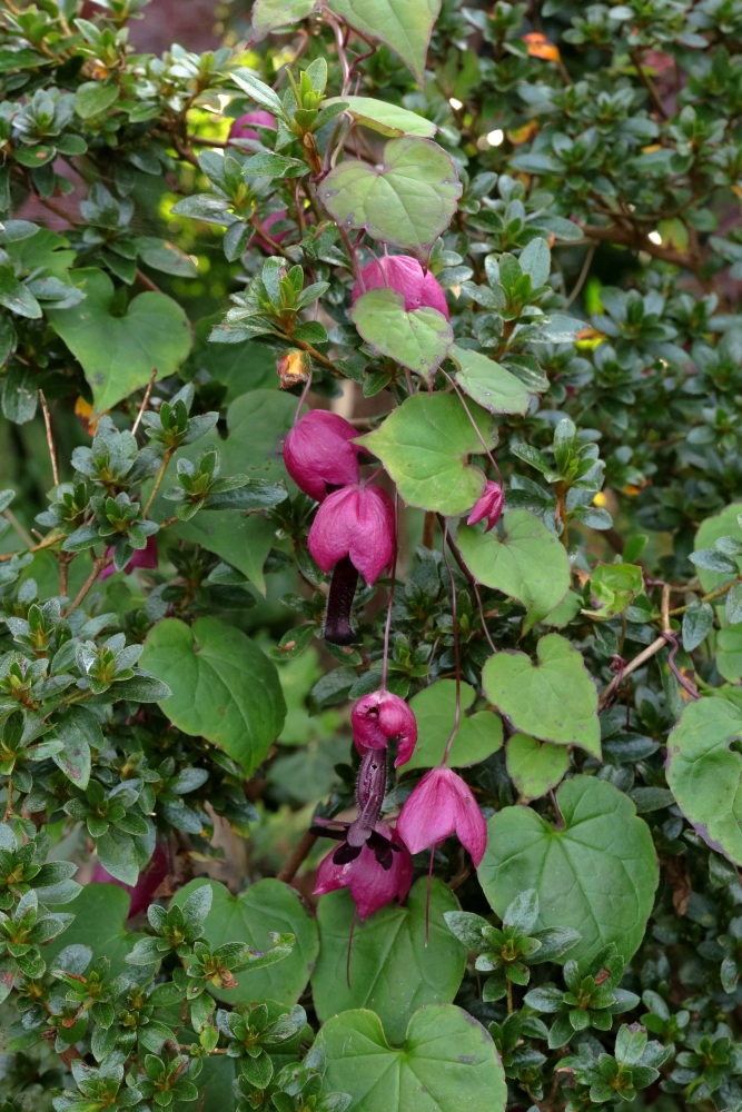 Rhodochiton atrosanguineus was great for us last year but set seed too late to start seedlings before the winter, meaning I sowed them this spring. I had formed the opinion that treating them as biennials was best, sown around June, planted out the following spring. This year I sowed them in the summer and didn’t put the sowing date in my spreadsheet, but the plan was to keep them until spring 2025 before planting them out. Most of the available space is filled with Maurandya in any case. A couple of plants really took off so I planted them to scramble over a lowish Azalea. Clearly they can be grown as annuals if germinated early in the year. The advantage of overwintered plants is that they are flowering when planted in spring, and never stop.