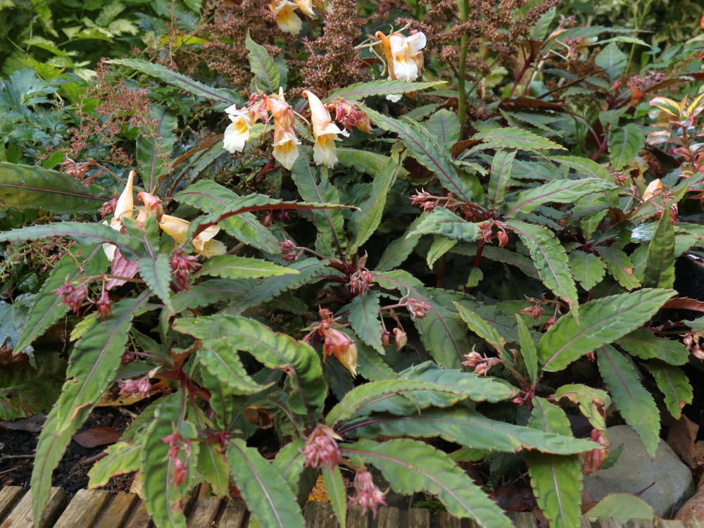 Impatiens omeiana is available in a number of forms but I am led to believe that this one may have arrived as a mail order plant direct from a nursery in China. Conveniently, I have long since forgotten where I obtained it, but I have grown it both in containers and in the ground and it is lovely provided it doesn’t ever dry out. Unfortunately, it almost always does dry out and thereafter looks miserable if it doesn’t go completely dormant. Not so this year; with no supplementary irrigation it has reached flowering time and is covered in buds. The red leaf colour which it sports earlier in the year has faded but it’s still a handsome plant.