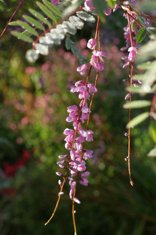 Suffice it to say, I went round the garden with my camera looking for six things to photograph and was less concerned with the subject of the picture than the qualities of light and shade, colour and proportion. And I ended up with about 150 photos, most of them awful. This is one of them, it’s Indigofera pendula.