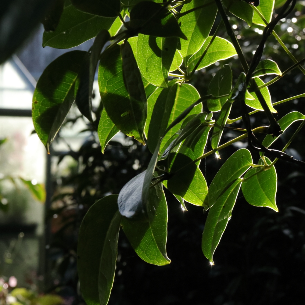 Holboellia brachyandra is something I’ve only ever photographed when in flower. Today it was bedecked with raindrops and cobwebs.