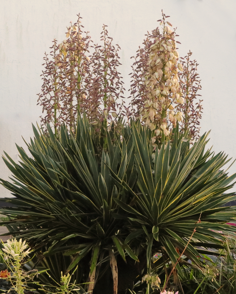 By noon it was raining so interesting tricks of the light weren’t going to happen any more. Out the front our Yucca gloriosa ‘Variegata’ is now starting to push up flower spike number 11. It’s earned another SoS appearance which throws up the usual dilemma of how to take its picture without all the neighbour’s clutter in the background. I’ve done my best.