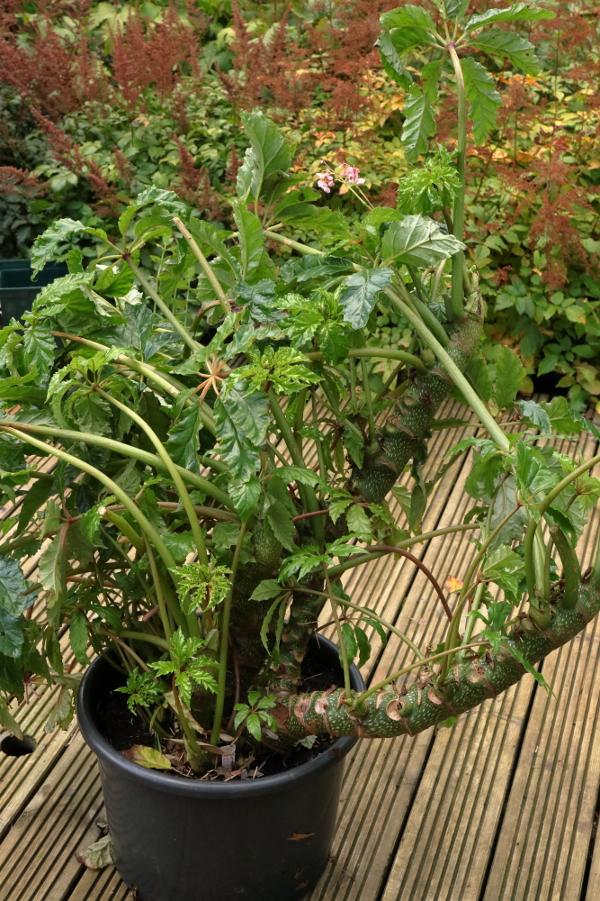 It spent last winter indoors in a cool room. It lost all its big leaves but never went entirely dormant so as the old leaves fell off, new leaves were being produced on new growth. In early summer I stood it outdoors in a sheltered and shady position, where it was very happy until October and the first of the winter gales, which left it looking a little beaten up.