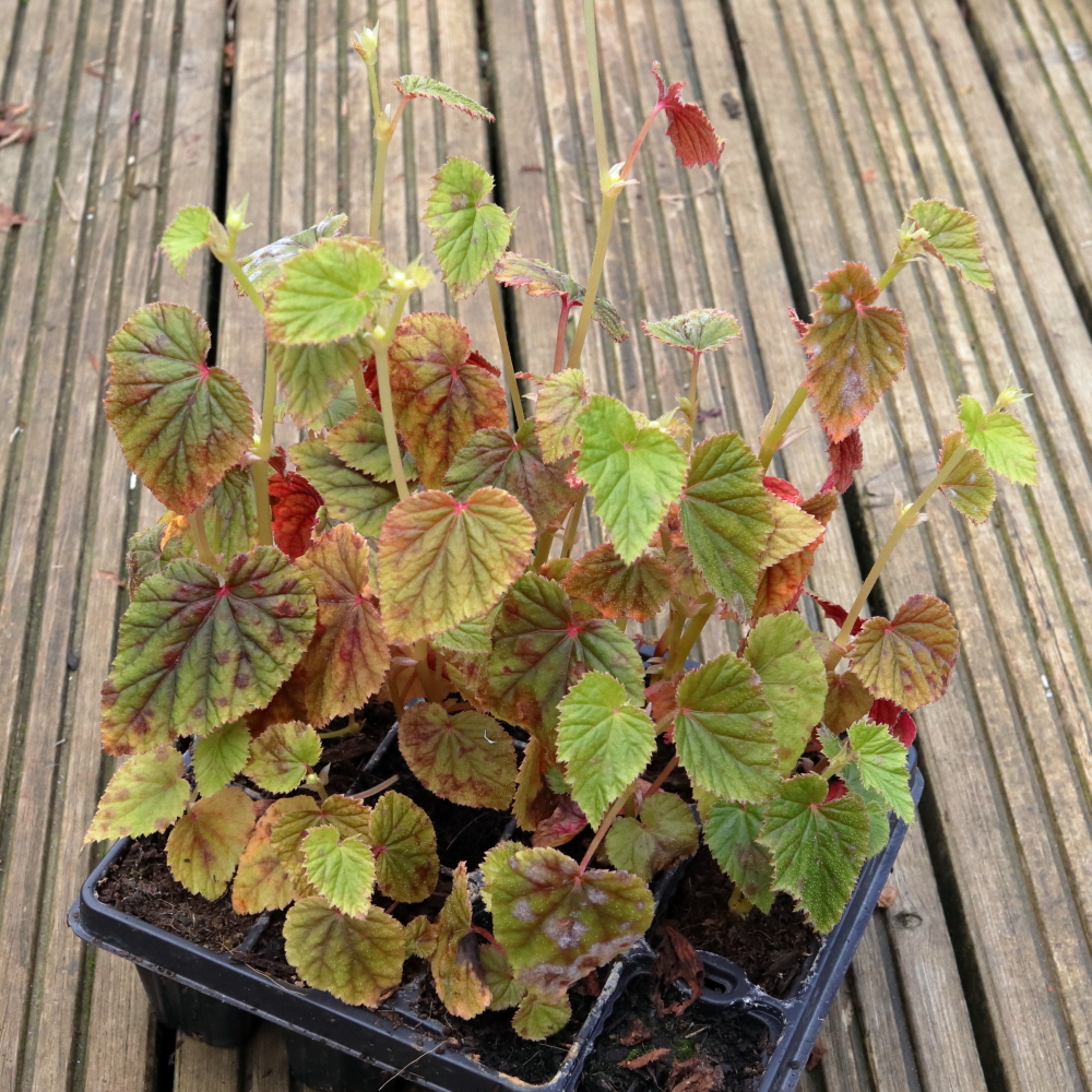 Begonia palmata ‘Tie Dye’ was planted to replace Begonia sinensis ‘Red Undies’ which had not emerged by June. It turned out that it was simply still dormant so I potted the corms and planted ‘Tie Dye’ where it had been. Begonia sinensis is a close relative of B. grandis and like that species produces bulbils in the leaf and stem axils as it collapses in the autumn. They were so tiny I simply wrote them off as highly unlikely to come to anything. A few weeks after planting ‘Tie Dye’ tiny plants of ‘Red Undies’ started to appear. I carefully lifted a dozen and potted them up in a cell tray to see how they fared. Very well, it turned out, making surprisingly good little plants considering how tiny the bulbils will have been and how late they started into growth. Hopefully they will survive the winter to come as well as they survived last years. I assume that this year they will carry over as tiny corms, perhaps with a few bulbils of their own to add to the stock. More have since appeared around ‘Tie Dye’, I could easily get another dozen, and probably will. They get a bit of mildew under cover but seem clean outdoors.