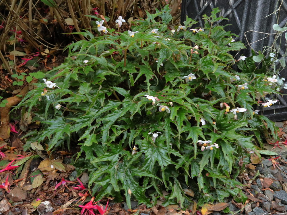 Begonia U614 was the second “hardy” begonia I obtained, after Begonia grandis. It was given to me as Begonia sikkimensis but is now regarded as unidentified. I still have a plant of my original form growing in the garden and it is probably as flowery now as it will be this season, which is quite a lot less flowery than at this time last year. It’s worth having for its deeply divided, silvery foliage, irrespective of flowers.
