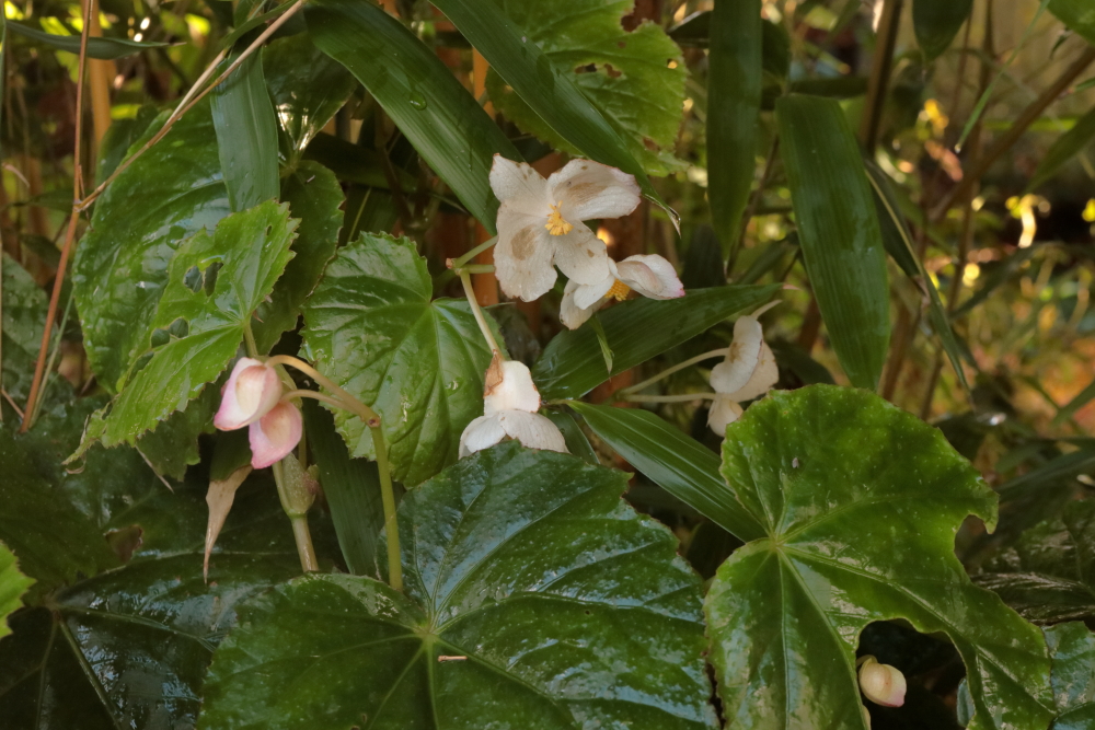 For precious little reason other than that is defying the weather and doing something, here is Begonia tengchiana. I’ve had it for years, growing in the shade of my big bamboo and covered with a smattering of dry leaves in winter. It makes about 18 inches of leafy growth and puts out a few undistinguished flowers in November, just in time to disappear until spring.