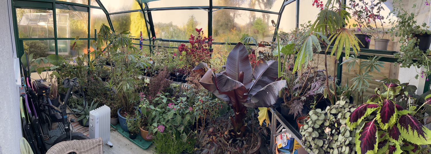 A lot of time earlier in the week was spent packing all the frost tender plants around the garden that we didn’t want to lose into greenhouses, where they will be kept just above freezing and hopefully survive. Here is the lean to greenhouse at the back of the house, the one we grandly call a conservatory. It gets to do a lot of conserving in the winter, keeping plants alive. It’s not a cosy garden room with comfy chairs in which to quaff a G & T.