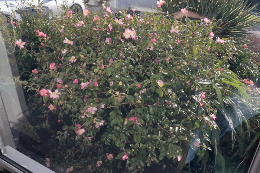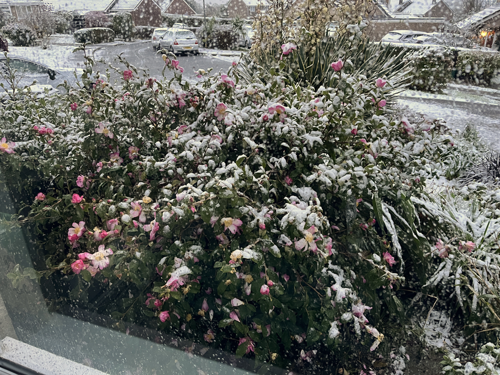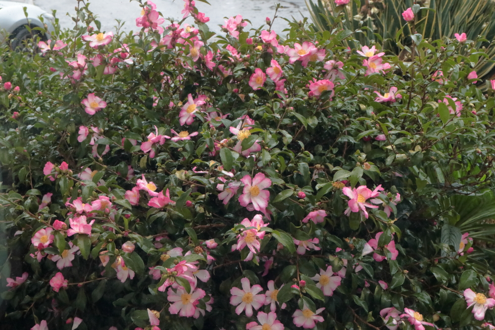 It hasn’t been cripplingly cold, barely down to freezing, and we’ve not had a lot of snow and it didn’t stick around long. It’s still taken a toll. Here is the same Camellia sasanqua ‘Navajo’ I included last week. Flower-wise it peaked on Monday; Thursday it had to endure snow, hail and rain and today there aren’t many flowers left. It has buds to come but not a lot.