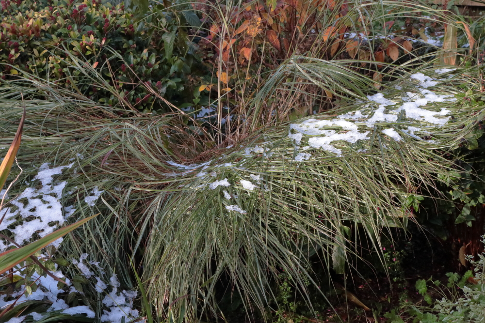 I do love a tall ornamental grass bowed over by wind, heavy rain or snow. They can look quite graceful and poetic. As long as it bows back upright again. No snow here yet!
