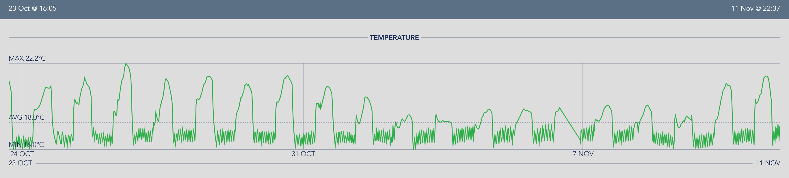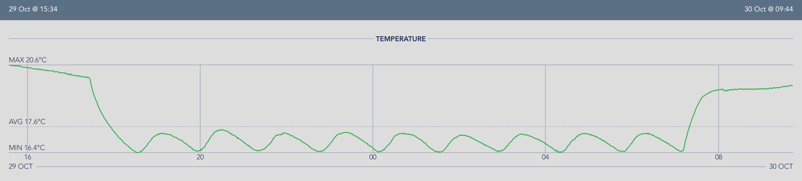 I put a data recorder in the propagator for a couple of weeks at the end of October and beginning of November which shows that the heater was operating for about 13 hours each night but not coming on during the day. When it was operational it would switch on, push the temperature up to the set temperature, switch off and go back down more slowly than it went up until the thermostat turned it on again. Thus when operational, it was on for about 50% of the time, meaning it was consuming electricity for about 7.5 hours a day. During the day, the grow lights provided enough heat to keep the propagator above the 17°C set temperature. With sunshine, the greenhouse itself heated up, taking the propagator temperature up with it.
