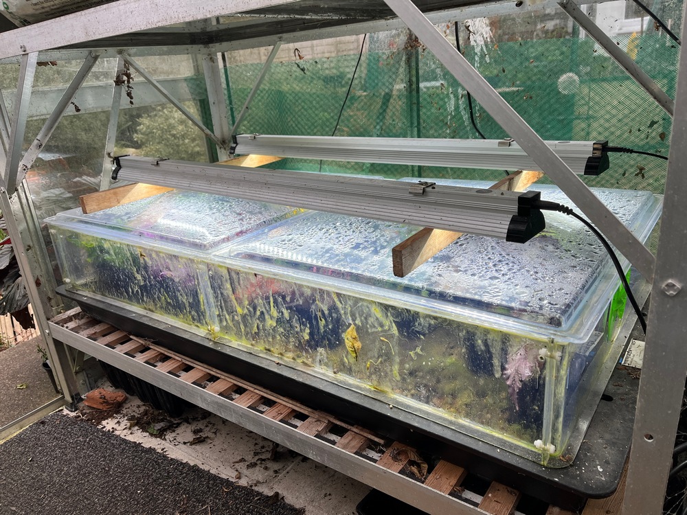 Above the propagator I have two grow lights, 87cm long and rated at 36w each. Natural light in the greenhouse is tricky because even a short burst of summer sunshine hitting a small area of the propagator will send the temperature inside rocketing. I have it screened from sunshine but open on the north and east sides, so it does get some natural light. The house blocks morning sun.