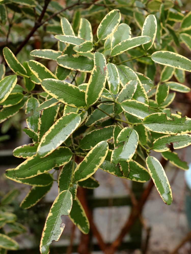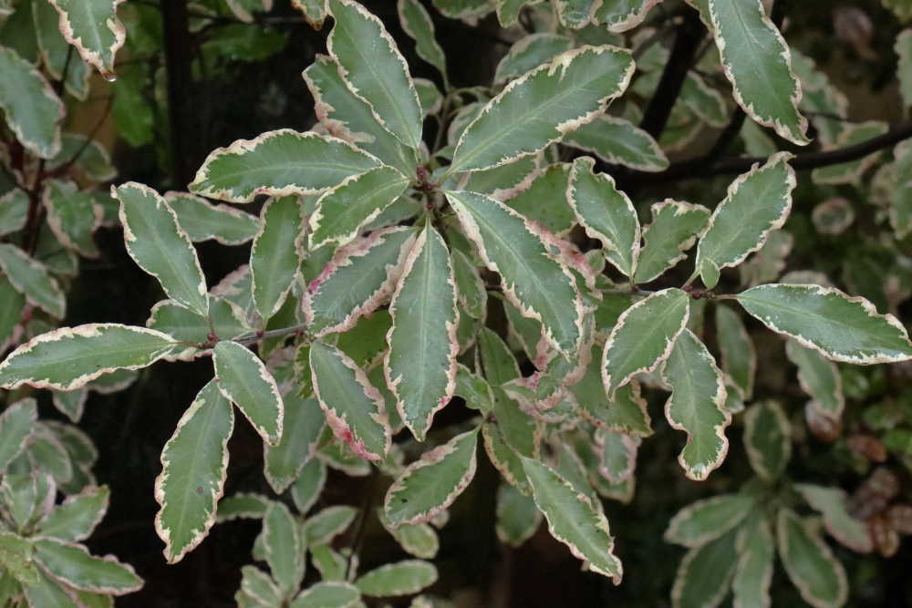 Eucryphia ‘Gilt Edge’ has small, cream edged leaves and is now around 8 feet tall. It has never flowered but I haven’t given up hope.