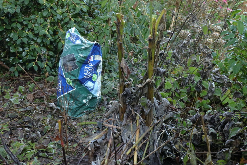 I don’t want to be wrapping up loads of plants in the garden in order to get them through the winter. I don’t mind piling a few leaves around things but I’ve too many borderline hardy plants to start giving them all elaborate protection. It also looks a mess. Podochaenium eminens was one that I was prepared to make an exception for, given how well it had done last year. I cut the bottom off a plastic sack, put it over the plant, which I’d cut down to a suitable height, filled it with dry leaves and put another plastic bag upside down on top. And before you ask, no, I don’t own a horse. The adjacent banana is being tested for hardiness.