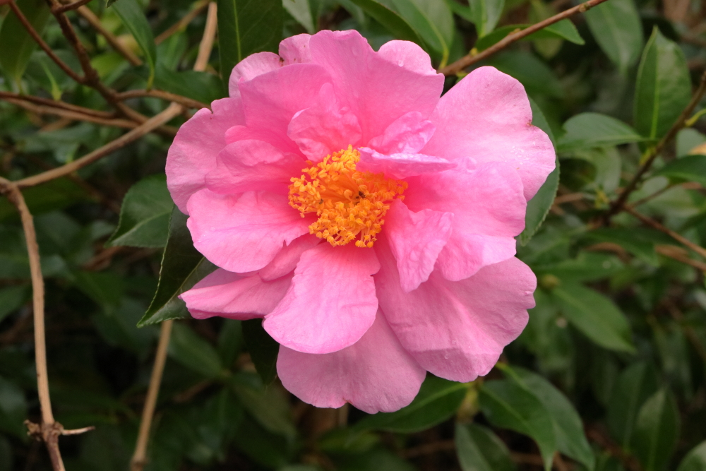 This would have been happening in the garden if there hadn’t been a frost last night. It was actually taken last year, by which I mean on Tuesday. I meant to measure it, something like 5 inches across, on the big side for a camellia, never mind a winter flowering variety. It’s ‘Show Girl’, a hybrid between an autumn flowering C. sasanqua and spring flowering C. reticulata. There are loads of buds still to come.
