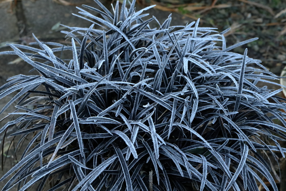 I went looking for something looking striking with a coating of frost and the best I could come up with was Ophiopogon planiscapus ‘Nigrescens’, which I put in only a couple of weeks ago, but not looking like this.
