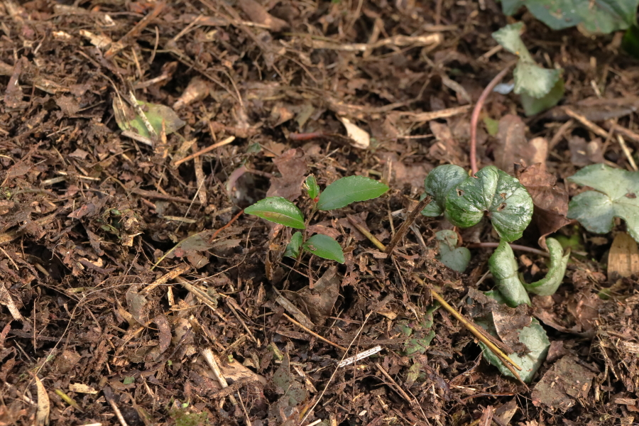 I’ve been working my way round the garden tidying things up. All the Hakonechloas and other grasses have now been cut down, as have several evergreen ferns. All has gone through the shredder then back on the ground. In the process of clearing dead leaves from around the cyclamen I have growing at the foot of Camellia lutchuensis, I spotted this seedling. It looks to me like a camellia, very possibly of C. lutchuensis, but I hadn’t noticed any fruits on the bush last year. I’m excited at the possibilities for what it might have been pollinated by; all I need to do is keep it alive and live long enough to see it flower.