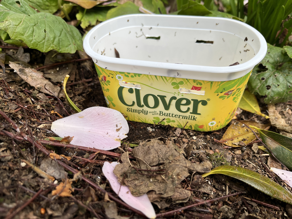 I prepare the traps by making three slots just below the rim of the pot with a soldering iron. The slots are 25-30mm long and 5mm wide. Even the very big slugs are evidently capable of getting through them. I have also used a margarine tub but it’s opaque so I have to take the lid off too see what I’ve caught, which can get messy. It’s also bright yellow so much more conspicuous in the garden. When there’s more foliage around, the clear pots will be quite discrete.