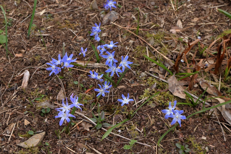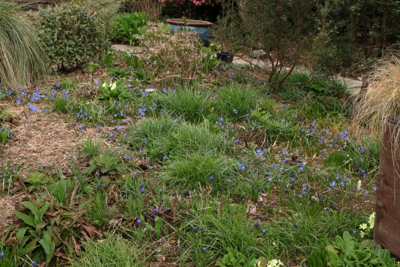 I fancy that my efforts to control slugs lie behind a much better performance from the masses of self sown Scillas that we’ve had this year. I put traps mong them when I saw the buds were being nibbled as fast as they opened and the damage stopped almost completely. I was looking at the bulletin that Wisley produced years ago about the “little blue bulbs” and I can’t work out which they are. Maybe the solid blues are Scilla sardensis (was Chionodoxa sardensis), those with white eye Chionodoxa luciliae or C. siehei or very possibly hybrids. They’re all Scillas now I believe.