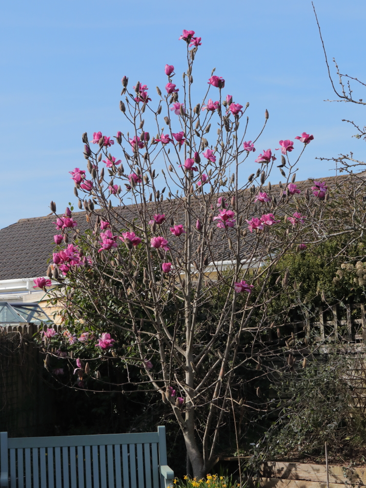 We had to get the hose out for various plants this week, as they were so dry from wind, sun and lack of rain. I am also certain that we are not clear of frosts yet here in fenland! Your camellia and magnolia both look fantastic. To see the colour of M. ‘Vulcan’ against that blue sky is quite a sight!