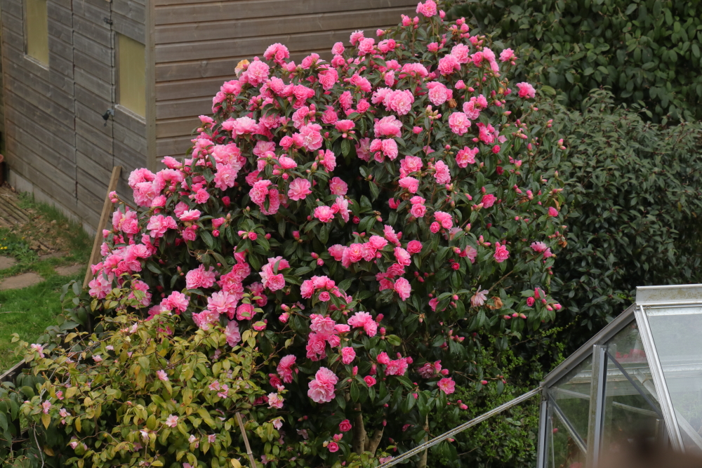 I showed you a close-up of a single bloom of Camellia reticulata ‘Mystique’ three weeks ago. Sadly it’s planted between a path and the garden boundary and I have had to trim it on the path side so we can get up the path. As a result our neighbours and the birds overhead get a better view of it than we do. From the bedroom window though, it looks like this. Sadly I’m getting Camellia petal blight on this and at least one other Camellia so will have to clear every fallen bloom to try to supress it.