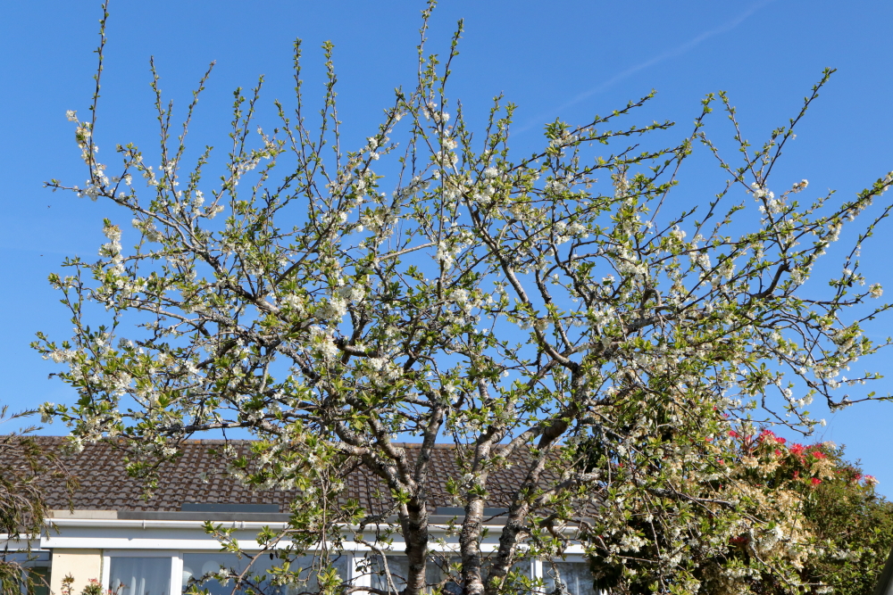 Last year’s plum crop was pathetic, perhaps because the blossom got frosted. It’s in full flower right now and the forecast for tonight, the last cold night before the weather changes, was for 3°C, which is a bit close for comfort. I need to prune it too. This is ‘Victoria’.
