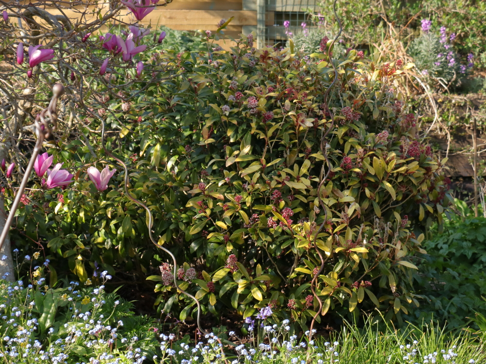 in the bottom right of the Magnolia picture is Skimmia ‘Rubella’. It has been there a long time, long enough to be 4 feet high and five feet wide. It’s dying, presumably with honey fungus, which has wrought havoc in that bed, taking down Camellia ‘Spring Festival’, Schefflera taiwaniana, Fuchsia ‘Lechlade Magician’ and Camellia ‘Ariel’s Song’ over the last half dozen years and heading in the direction of the Magnolia. I treated it with Trichoderma but probably too late to save it.